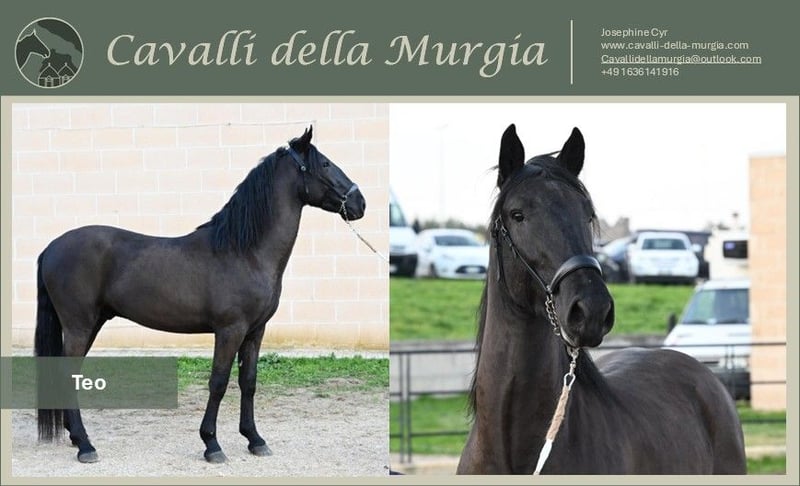 Geboren in 2023, ongeveer 1,58 m groot en nu al een echte blikvanger! Teo is niet alleen zeer goed te hanteren met een halster, maar is voor zijn leeftijd ook uitstekend getraind. Hij toont zich mensgericht, sportief en elegant – een paard met veel potentieel. Hij komt uit een fokkerij die grote waarde hecht aan goed omgang en desensibilisatie. De opleiding gebeurt op een speelse manier en met veel vertrouwen. Heeft Teo uw interesse gewekt en wilt u hem graag persoonlijk ontmoeten? Momenteel staat Teo nog in zijn thuisland, Apulië. Wij helpen u graag bij het plannen van een bezoek. Teo wordt via Cavalli della Murgia aangeboden. Röntgenfoto’s, evenals meer foto’s en video’s, sturen wij graag op aanvraag. De volledige aankoopafhandeling, inclusief keuring en transport naar Duitsland, regelen wij eveneens voor u. Heeft u nog vragen? Stuur ons gerust een e-mail – cavallidellamurgia@outlook.com. We kijken uit naar uw bericht!