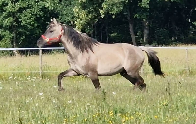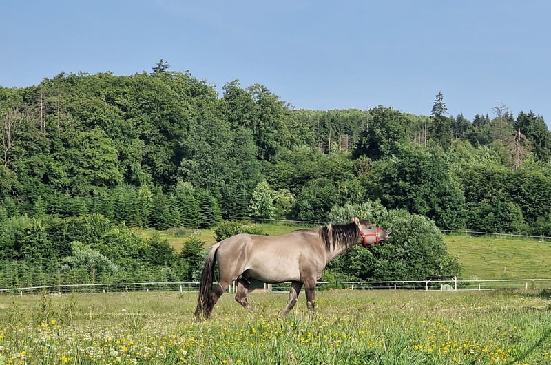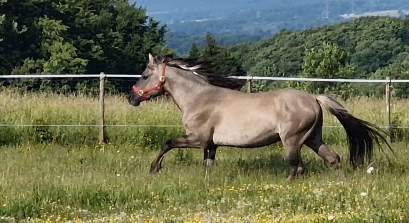 Rocky is a very friendly and people-oriented stallion. He passes on his beautiful movements to his offspring. Rocky has a strong, correct foundation with large and hard hooves. On our website www.a1-suffield-mustang.de, you will find pictures of his offspring as well as other Mustang stallions. His offspring always come with papers. If you are looking for a special color, he is the right one. He always passes on the dun gene (two-colored mane, zebra stripes, and dorsal stripe) and does not produce red. a/a D/D E/E The breeding fee for other breeds is 1000 euros, for Mustangs 2000 euros.