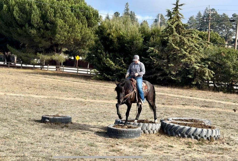 ONLINE AUCTION Place your bids at www.PlatinumEquineAuction.com Starting Bid $3500 Auction ends December 1st, 2024 Need a new saddle? Check out White Rock Saddles on our website or Facebook! Cuervo is a 10yr old titled BLM mustang off the Stone Cabin, NV HMA. He stands 14.2HH and has thick bone and a strong build. When I tell you, you won’t find a better trail stead I mean it! Cuervo is an absolute blast to ride long rides with your friends, or adventure alone. Being raised out in the steep terrain he is the epitome of sure footed and SAFE! He will travel through literally anything and never take a wrong step. He navigates through steep drops, rushing rivers, tree limbs, and rocks like a dream. Cuervo loves to go explore and always is the best mannered guy. He can lead the pack, stay in the middle, follow up the hind, or venture off alone and he will be content in any situation. Nothing phases him, he stays sane and quiet in all scenarios. We have carried flags, gone over tarps, and he is a natural pro at the trail course obstacles. Cuervo never refuses, or bocks at anything. He is the most willing, calm minded horse I have ever been around. We have also exposed him to roping and cattle and he has taken a liking to it and shows promise! He respects leg pressure, has the lightest touch neck rein handle, knows his leads and has pretty circles in the arena. He has an easy stop and reverses with light pressure. This guy can be left off and never change his sweet calm demeanor. He has no spook, no buck and no bolt making him a choice for any level rider. Cuervo always stands patiently tied for tacking, grooming and bathing. He will let you clip every hair on his body, face and ears no problem. Cuervo stands amazing for the farrier and has GREAT solid black feet that are easily maintained. He can load up in the trailer all by himself and back out easily. He’s been pastured with multiple horses or stalled alone. He doesn’t get buddy OR barn sourness. Cuervo is the definition of fun, safe and sane! If you’re a person wanting to be competitive in trail versatility competitions this is the guy for you! He would also accommodate anyone just wanting to maximize their joy of riding! We know you’ll love Cuervo just as much as we do! For any more information, please contact Cheyenne Rey 831-537-8746. He is located in Bitterwater, CA. ONLINE AUCTION Place your bids at www.PlatinumEquineAuction.com Starting Bid $3500 Auction ends December 1st, 2024 Need a new saddle? Check out White Rock Saddles on our website or Facebook!