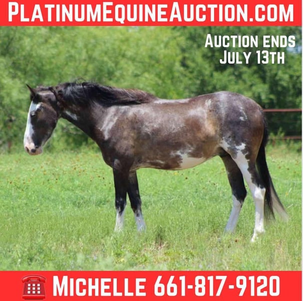 ONLINE AUCTION Place your bids at www.PlatinumEquineAuction.com Starting Bid $3500 Auction ends July 13th 2025 Need a new saddle? Check out White Rock Saddles on our website or Facebook! Are you ready to own the flashiest Mustang around? Look no further than 2-Tone! This stunning 5-year-old BLM branded gelding stands at a perfect 14.1 hands tall and is bursting with personality. If you’re searching for a horse that’s not just beautiful but also a true companion, 2-Tone is the one for you! With an easygoing nature, 2-Tone is the type of guy who loves to be right by your side. He’s seen countless miles of trails from Utah to Texas, and he’s ready for more adventures with you! Whether it’s crossing logs, navigating bridges, or splashing through water, he confidently tackles all types of terrain. In fact, he’s proven his skills with trail courses, where he shined brightly! This guy will even carry a flag without a hitch, showcasing his calm demeanor. 2-Tone has a fantastic stop and backs up with ease, making him a joy to work with. We use him at the sale barn to pen cattle and push cattle up the alleys, and he’s a pro at it! He’s walked through the bustling Fort Worth Stockyards like a seasoned veteran, effortlessly managing crowds, carriage horses, and even longhorn cattle drives. 2-Tone is a breeze to catch in the pasture—he’ll come right to you! He loads and unloads like a champ, is barefoot, and gets along wonderfully in a herd setting. If you’re looking for a horse that’s as friendly and fun as he is. 2-Tone is ready to be your next best friend. Don’t miss out on the chance to make this amazing Mustang a part of your life! We are open to anyone interested in him to schedule a time to come see him or if you can’t make it schedule a FaceTime showing to see him. If you need help with transport don’t hesitate to ask we have a list of reputable haulers that can get him safely to your doorstep WORLD WIDE including, Alaska , Mexico, Hawaii, Canada and anywhere in between. Contact M$ Performance Horses Michelle 661-817-9120 with nay questions. ONLINE AUCTION Place your bids at www.PlatinumEquineAuction.com Starting Bid $3500 Auction ends July 13th 2025 Need a new saddle? Check out White Rock Saddles on our website or Facebook!