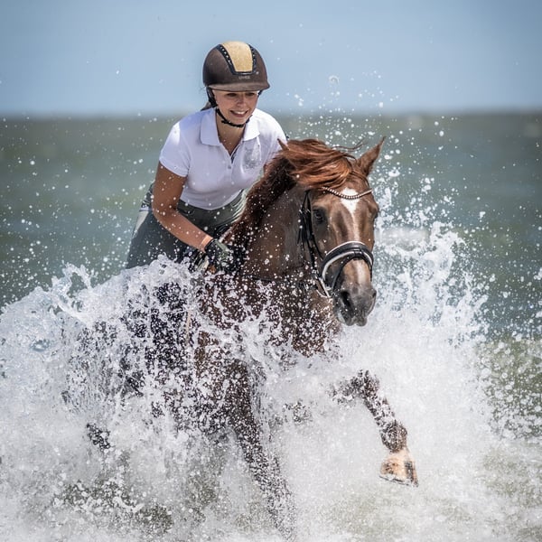 For sale is a beautiful 10-year-old dark chestnut mare (New Forest Pony). She has a height of 152 cm and comfortably accommodates taller riders. She is well-behaved in handling, loading, and farrier visits, with no vices. In the terrain, she is fearless, whether alone or in a group. She has been to the North Sea coast multiple times and simply enjoys it. Her cool and always reliable nature makes her a special family horse. She always gives a sense of security, making her suitable for children or less experienced riders. Under saddle, she shows no bad habits, whether in the indoor arena or on the riding school grounds. She has also been ridden by children in a riding school competition with side reins. She is trained up to A-Dressage (placed in A**-level dressage). She is healthy, regularly vaccinated and dewormed, and is only available to the best of hands. Videos and photos will be sent upon serious interest.