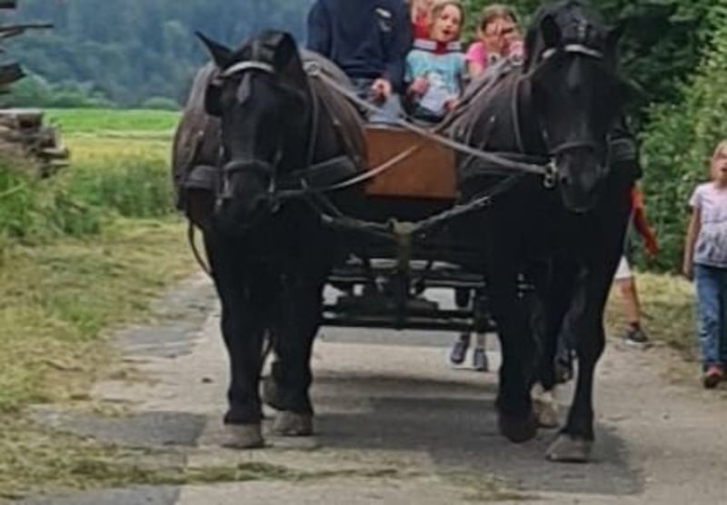 Verkaufe 12-jährige Noriker-Rapp-Stute ohne Abzeichen, geb. 11.03.2013. Regelmäßig gefahren, furchtlos, egal ob Menschen, Maschinen, Traktoren, LKWs, Hunde, ... Auch sehr kinderlieb. Kinder sind oben gesessen, sie wurde allerdings nie richtig eingeritten. Wurde regelmäßig zwei-spännig mit Gästen gefahren. Kennt Offenstall- und Weidehaltung. Sie hatte bis jetzt noch kein Fohlen. Sucht liebevollen Platz. Optional auch als Gespann abzugeben.