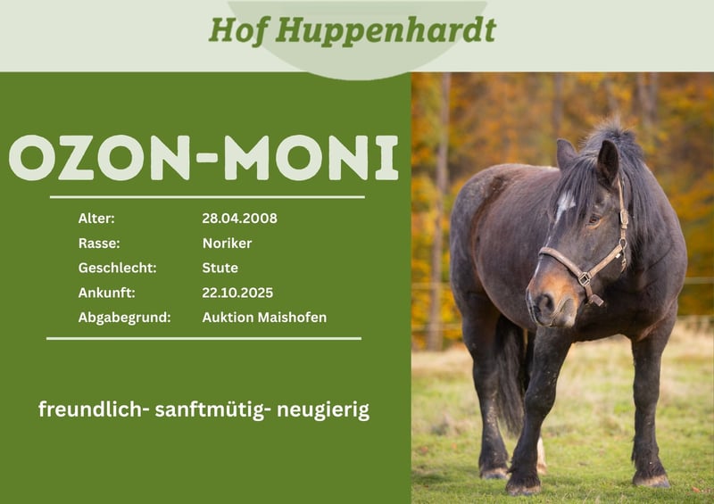 Wir suchen ein neues Zuhause für unsere Noriker-Stute Moni. Die am 28.04.2008 in Österreich geborene Stute wurde von uns im Oktober 2025 auf einer Schlachtfohlenauktion zusammen mit 4 anderen Pferden gerettet. Bei uns zeigt sie sich neugierig und kooperativ. Sie steht bei uns zusammen mit einer großen gemischten Gruppe im Offenstall und genießt die Weidezeit. Sie hängt viel mit unserer anderen Noriker-Stute zusammen. Sie ist eher ranghoch, aber nicht unfair. Laut Vorbesitzer wurde Moni geritten und auch gefahren. Wir haben bis jetzt nur gemütliche Schritt-Ausritte getestet, dies meistert sie mit Bravour! In erster Linie war Moni in der Vergangenheit Zuchtstute, wurde aussortiert, weil sie nicht mehr aufnahm. Moni ist Menschen gegenüber aufgeschlossen, lässt sich überall berühren und fasst schnell Vertrauen. Wir wünschen uns für sie ein neues Zuhause mit eigenen Menschen, wo sie das Pferdeleben richtig kennenlernen kann. Wir sind ein Tierheim für Großtiere. Alle unsere Schützlinge werden nach positiver Vorkontrolle und gegen eine Schutzgebühr vermittelt. Gerne können die Tiere nach vorheriger Terminabsprache bei uns auf dem Hof besucht und kennengelernt werden.