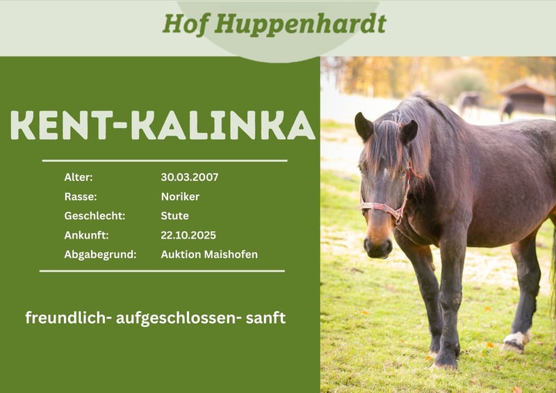 Wir suchen ein neues Zuhause für unsere Noriker-Stute Kalinka. Die am 30.03.2007 in Österreich geborene Stute wurde von uns im Oktober 2025 auf einer Schlachtfohlenauktion zusammen mit 4 anderen Pferden gerettet. Bei uns zeigt sie sich neugierig und liebevoll. Sie steht bei uns zusammen mit einer großen gemischten Gruppe im Offenstall und genießt die Weidezeit. Sie hängt viel mit unserer anderen Noriker-Stute zusammen. Sie ist eher ranghoch, aber nicht unfair. Vieles ignoriert sie einfach. Vom Vorbesitzer wissen wir leider nicht viel zu ihrem Ausbildungsstand. Wir haben bis jetzt nur gemütliche Schritt-Ausritte getestet, dies meistert sie mit Bravour! In erster Linie war Kalinka in der Vergangenheit Zuchtstute, wurde aussortiert, weil sie nicht mehr aufnahm. Kalinka ist Menschen gegenüber aufgeschlossen, lässt sich überall berühren und fasst schnell Vertrauen. Wir bekamen sie mit einem schlechten Hufzustand und mussten eine chronische Hufrehe bei ihr feststellen. Aktuell wird ihre Fehlstellung mit einem orthopädischen Beschlag korrigiert, die Behandlung zeigt bereits Erfolg. Trotz chronischer Rehe geht sie unter Beobachtung mit unseren anderen Pferde auf die Weide. Bei gutem Management ist täglicher Weidegang bei ihr kein Problem. Wir wünschen uns für sie ein neues Zuhause mit eigenen Menschen, wo sie das Pferdeleben richtig kennenlernen kann. Wir sind ein Tierheim für Großtiere. Alle unsere Schützlinge werden nach positiver Vorkontrolle und gegen eine Schutzgebühr vermittelt. Gerne können die Tiere nach vorheriger Terminabsprache bei uns auf dem Hof besucht und kennengelernt werden.