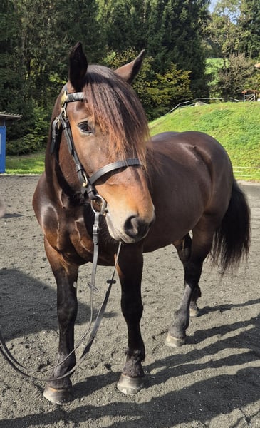 Wir verkaufen eine charmante, braune Norikerstute die mit ihrer rassetypische und typvoller Art überzeugt. Mit einen gut schreitenden Schritt und einer soliden Trabbewegung wurde sie mit 7,68 Punkten in das Stutbuch eingetragen. Flair wurde bereits zweispännig gefahren und kennt die ersten Übungen unter den Reiter. Sie ist verlade - und schmiedefromm.