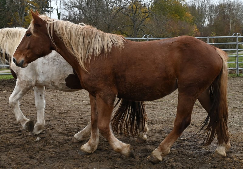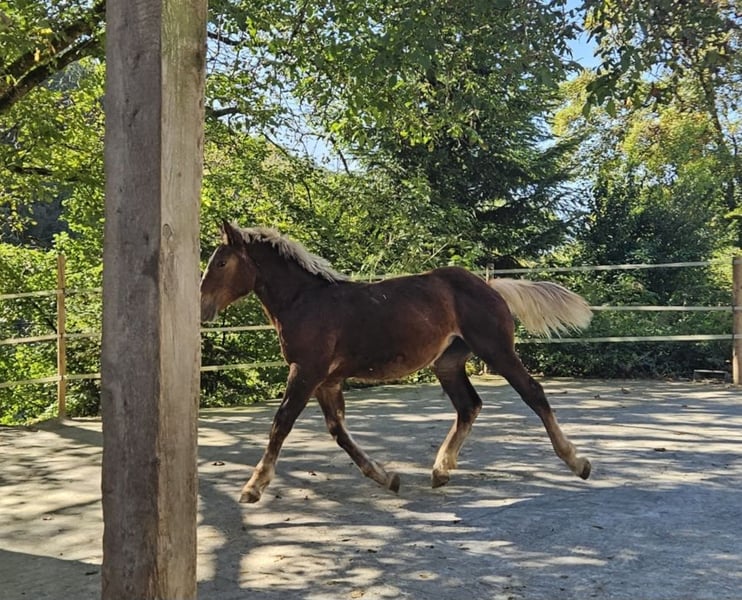 Dit mooie, majesteitelijke donkervos Noriker merrie zoekt haar mens. Larissa is geboren op 5 februari 2023 en wordt dus 3 jaar oud. Ze wordt ongeveer 1,63-1,65 m groot. Larissa is zelfverzekerd, vriendelijk en beheerst de basis van de jonge paardenopleiding goed. Ze vindt het heel leuk om verzorgd te worden en blijft rustig en braaf staan. Zoals al mijn paarden, kent Larissa kinderen, katten, koeien, alpaca's, boerderijmachines, auto’s en honden. Ze bracht haar eerste zomer met haar moeder door op de alm, en bij ons leeft ze op een diervriendelijke manier in een groep. Tijdens de zomer is ze altijd buiten geweest. Larissa heeft een heel mooie, ruimte-innemende draf. Ze wordt regelmatig ontwormd, gechipt en geregistreerd. Larissa beschikt over een volledig papier en is voor alle disciplines zeer interessant. V: Balisto Nero MV: Engelbert Vulkan