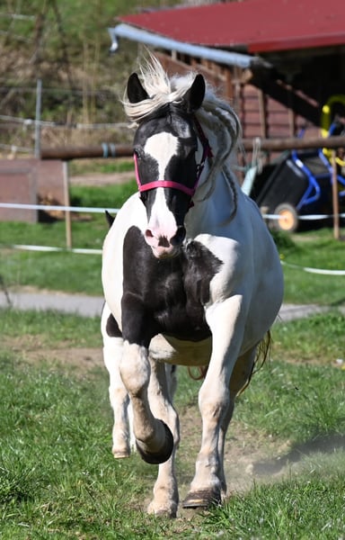 Jasmina was born on May 21, 2017, she is approximately 161 cm tall and has a very lovable and good-natured character. Additionally, she has an incredible charisma that captivates people. She is very well ridden, both in the arena and on trails. She is currently being used in our riding school and can also be ridden well by beginners. She is fearless and traffic-safe. Jasmina has been registered as a breeding mare in the studbook with a score of 7.50, and so far she has had 3 filly foals, 2 of which are pinto and one is a black foal, all of good quality. She is in foal to Hennessy Schaunitz for spring 2026. Jasmina has a good neck and a very well-split croup, good basic gaits with a very nice, spacious trot. She is shod all around and this should remain so; she has been tested free of PSSM1, vaccinated, and regularly dewormed. Jasmina loads calmly into the horse trailer and is farrier-friendly. Sire: Firon Elmar, Dam Sire: Lotto Vulkan