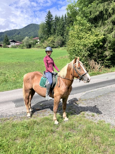 Er wurde jetzt schonend angeritten und geht schon bereits im Trab sehr brav durchs Genick und ist sehr fein im Maul. Auch beim Ausreiten ist er immer interessiert, aber nicht schreckhaft.