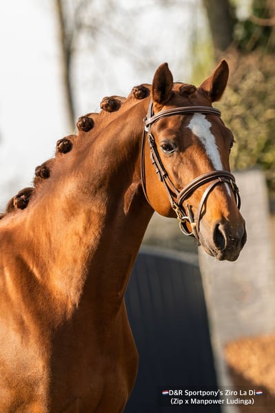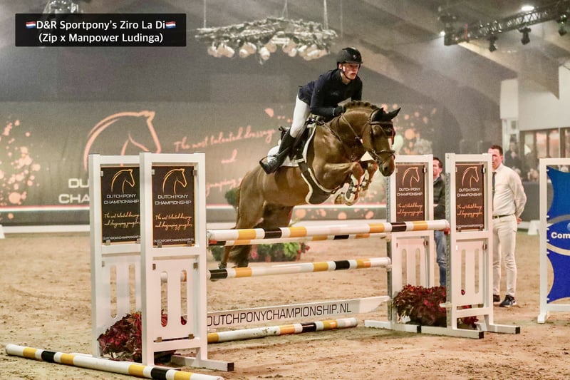 D&R Sportpony’s Ziro La Di Afstamming: Zip (v.Zodiak) x Manpower Ludinga Geboortejaar: 2017 Stokmaat: 1.48m Goedgekeurde hengst (Kan gecastreerd worden) D&R Sportponys Ziro-La-Di (Zip x Manpower Ludinga) is een zeer interessante allround ponyhengst. D&R Sportpony's Ziro-La-di viel tijdens de hengstenkeuring van 2020 op door zijn sterke beweging met aansprekend voorbeen gebruik, super spring techniek, lang gelijnde bouw en een echte hengsten uitstraling. Een super fijne hengst met en top karakter. Zijn vader, de recentelijk met het KEUR predikaat bekroonde ponyhengst Zip (Zodiak x E-Boy), is een internationale dressuurtopper terwijl de genen van Zodiak ook internationaal in de springsport zeer goed uit de voeten komen. Zip liep met Jill Bogers in de internationale dressuursport met mooie A-kader scores en loopt inmiddels met zijn vierde amazone Z-dressuur. De moeder van D&R sportpony's Ziro-La-Di is de palomino Keur merrie Mistique La-Di (V. Manpower Ludinga). Als 3-jarige werd zij nationaal kampioen op de NRPS keuring. Op de keuring viel de merrie op door haar lang gelijnde bow, aansprekend voorbeen gebruik en een sterk achterbeen. Dit heeft zij dan ook door gegegeven aan haar zoon Ziro-La-Di. De merrie heeft op 4-jarige leeftijd de Subli Cup bij het springen gewonnen en heeft zelf inmiddels nationaal Z gesprongen. Vader van Nationaal Veulenkampioen (🇳🇱D&R Sportpony’s Zidane🇳🇱 reeds goedgekeurd bij het AES Stamboek in 2024) en de Nr 3 (Nova La Vie) van 2021 🏆🥇🥉 Prestaties; 🏆🥇 Kringkampioen Springen Klasse B Nr 1 geplaatst op stijl bij de 5- jarige Dutch Pony Championship springen 1.00/1.10 - Springen L - Dressuur geplaatst Z- Dressuur klaar Voor meer info neem dan contact met ons op D&R Sportpony's