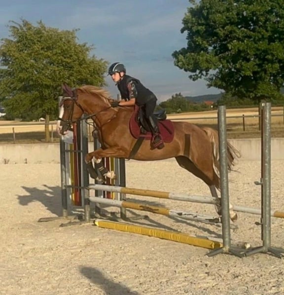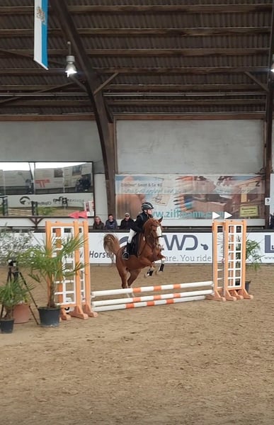 Elegant Dutch Riding Pony mare for sale – perfect for show jumping enthusiasts or beginners We are offering a beautiful chestnut mare, four high white stockings, born in 2016, with a height of 14.8 hh. A reliable partner for jumping up to 80 cm. She has never refused at a competition. She confidently handles unfamiliar cross-country jumps, is fearless, and assists the rider when needed. However, she is quite energetic in the arena, making her suitable for children or youth with a soft hand, as she always wants to jump. She is easy to handle even for the smallest riders. She loads calmly onto the trailer and is barefoot, making her suitable for grass arenas and trail rides as well. Unfortunately, she is somewhat wary of other horses and does not get along with two of my other mares, which is why she stays in a box at night and on a paddock during the day instead of in a herd. In dressage, there is room for improvement, but she also suits experienced adult riders well, so a confident rider can comfortably ride her. A fantastic horse for ambitious riders seeking a reliable partner for leisure riding or as an introduction to show jumping! Please contact me via WhatsApp at 01704696745. Text messages only, as the reception for calls is poor! Videos available on Rimondo under "Lianne 7" or on Instagram "reiterhofkempf" – Highlights: "Anne"