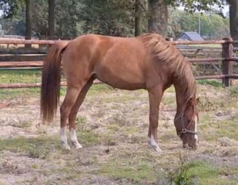 Due to personal circumstances, we are significantly reducing our herd. Therefore, we are offering a very well-moving 2.5-year-old chestnut mare (almost 3 years old) for sale. Heimolen's Felicia is a 2.5-year-old chestnut mare approximately 145 cm tall. She is the daughter of the approved black Welsh stallion Old Avenue's Cezar, who has been sold to America. Her dam is the multiple national champion mare KEUR + PREFERENT, Belicia. From this mare, several champions have been bred, including the NRPS dressage champion stallion Harvey’s Dream of Gold and the overall champion of the Dutch Pony Championship 2023: Durello. Durello was the most expensive lot at the Elite Dressage Pony Sales, selling for €25,000! Belicia is also the dam of Heimolens Sparklings Lizzy, the 3-year-old national reserve champion KEUR mare of 2024. Thanks to her very strong movements, Felicia is a highly interesting and eye-catching prospect for both breeding and/or as a sport pony! She will probably grow to a perfect height of around 1.47–1.48 meters. For more information, please CALL! Twan: +31 6 53 47 22 60