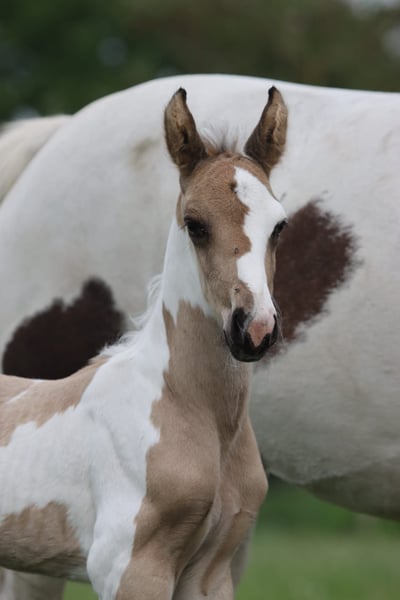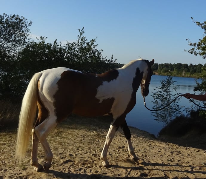 Unique Spotted Falcon Foal, a talented and striking young horse, aged 3 years. An excellent choice for showing in the arena or on a cross-country course. Spotted falcon is a rare coat pattern! #Tobiano Buckskin# Are you looking for a truly unique horse, not only in character but also in appearance and movement? Then look no further! He is not only beautiful, with an upright build and three very smooth and spacious gaits, but also a friend for life in terms of temperament. A loving, reliable, honest, and gentle companion who will go through fire for you! DETAILS: - Born on May 16, 2022 - Currently measures 1.63 m (approx. 16.1 hh), expected height around 1.65 m - Registered with the NRPS - Microchipped, vaccinated, dewormed as needed, and regularly checked by the veterinarian TEMPERAMENT: - Easy to handle, with trust being very important to him - Sensitive to aids, making him very easy to train; perfect for dressage - Affectionate, honest, reliable, sweet, and a big cuddler - Needs a clear, consistent leader who is honest, patient, loving, and gentle. He does not respond well to harshness; it makes him nervous and causes him to withdraw - Clearly communicates his limits; when tired, he respectfully asks to stop PHYSICAL CHARACTERISTICS: - Elegant yet strong build - Well-muscled hindquarters and neck - Colorful: Tobiano Buckskin with a silky, radiant coat. A true color wonder. His coat color changes with the seasons - Manes/tail: Full tail, mainly white with some black; mane mostly white with black and brown streaks in the forelock; white and black eyelashes. Please note: the coat color appears brown in the photo but is clearly a falcon pattern in reality! - Excellent health and very strong hooves - Extremely agile, a plus for dressage KNOWN WITH: - Fully traffic-safe; familiar with all farm vehicles, trucks, and other road users - Acquainted with various animals - Well-behaved at the farrier, veterinarian, and dentist - Saddled and experienced in lunging, groundwork, Natural Horsemanship, Parelli, etc., and loves swimming! - Familiar with longe, Pessoa, bridle, bareback pad, saddle, blankets, and other equipment - Currently only ridden in walk under saddle - Highly suitable for sport, including dressage, jumping, driving, or recreational riding - Very eager to learn and willing to work - Complete history known; in our possession since he was 6 months old, trained from day one - Has always been kept outdoors 24/7 in a paddock with an indoor/outdoor stable, summer turnout. Among the two horses we own, he is the herd leader PEDIGREE: #V: Polish Cremello Stallion #VM: HURO'S FANTASTIC COLOR Stallion, 2010, Tobiano Buckskin, 1.73 m KWPN 528003201012094 1.30 m, Spr. ZZ-Licht Interested parties, please request the pedigree via message #VMM: NANDO Stallion, 1995, Black, 1.64 m KWPN 528003199500961 Harness horse LK+55 Interested parties, please request the pedigree via message Mother registered with the AES studbook, with her sire and ancestors all KWPNers, excelling as show jumping horses up to 1.70 m. Her mother and maternal grandparents are KWPNers as well, performing at high levels in driving sports. The mother is ridden and driven. We have only begun with walk under saddle; due to current weather conditions and the arena's limited usability, further training is temporarily on hold. He adapts quickly and easily to new tasks. Given his young age, we do not want to rush. Trial riding is not possible at this time; he is still fully trainable according to his own pace. A beginner rider is not what we envision as his future owner. Photos show different ages, from just born to now. The rider in the photos is 1.75 m tall. The latest photos are of the parents: his father is a Cremello stallion with blue eyes, his mother is a tobiano. Price: €6,000 Optional: Black leather dressage saddle available for €250, with the possibility to purchase additional equipment. Videos under saddle available upon request. Please see my other listing for another horse for sale. Horses are being sold due to the end of our hobby caused by lack of time. They are not in our way! If you are interested and would like to meet this beautiful animal, I look forward to hearing from you! Not reachable on Saturdays.
