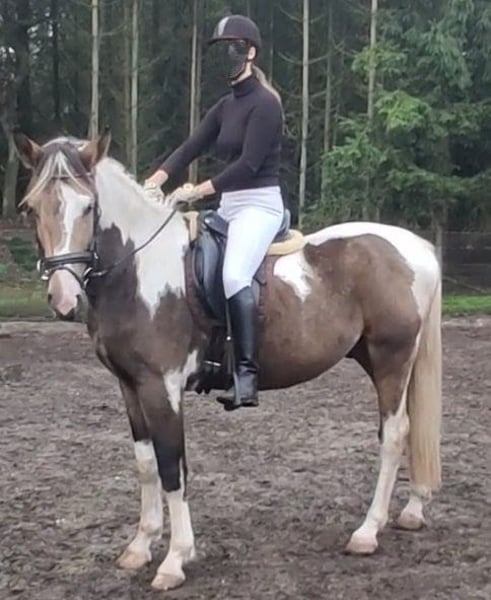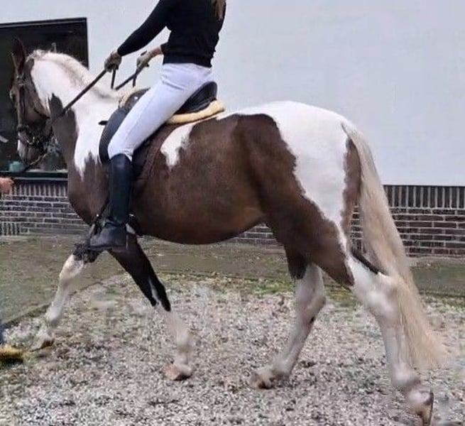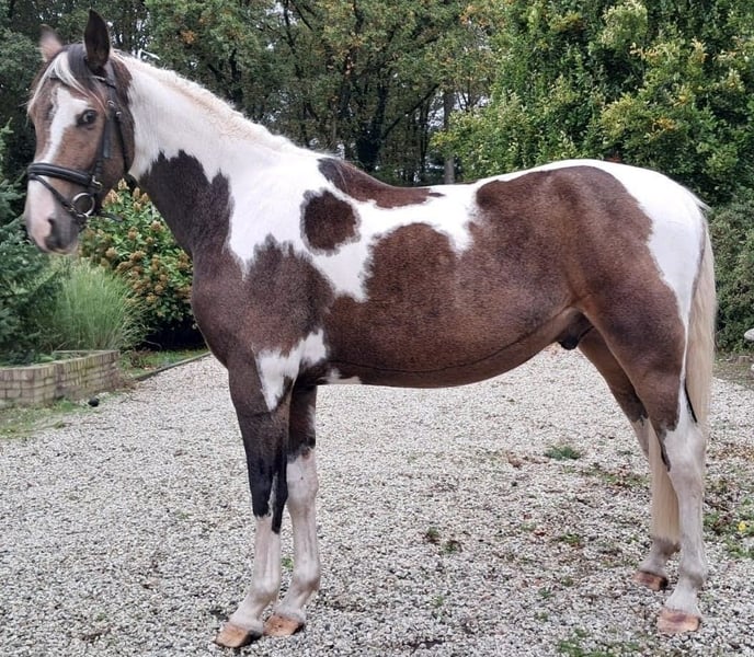 Unieke bonte valk ruin, talentvolle en bijzondere verschijning, 3 jaar oud. Een paard om mee te schitteren in de ring of een parcours. Bont valk is een kleur die zelden voorkomt! #Tobiano buckskin# Wil jij een echt uniek paard, niet alleen qua karakter, maar ook qua looks en beweging? Zoek dan niet verder! Hij is niet alleen mooi, opwaarts gebouwd met 3 zeer fijne en ruime gangen, ook qua karakter is dit een vriend voor het leven! Een liefdevol, betrouwbaar, eerlijk en zachtaardig maatje die voor je door het vuur gaat! GEGEVENS: -Geboren op 16-05-2022. -Meet momenteel 1.63m. Verwachtte stokmaat rond 1.65m. -Ingeschreven bij het NRPS. -Gechipt, gevaccineerd, ontwormd indien nodig en onder controle van tandarts. KARAKTER: -Makkelijk in de omgang, waarbij vertrouwen voor hem heel belangrijk is. -Gevoelig voor de hulpen waardoor zeer makkelijk trainbaar. Perfect voor dressuur. -Aanhankelijk, eerlijk, betrouwbaar, lief, enorme knuffel. -Heeft een duidelijke, consequente leider nodig die eerlijk, geduldig, liefdevol en zachtaardig is. Een harde hand begrijpt hij niet, wordt hij bang van en kruipt vervolgens in zijn schulp. -Hij geeft duidelijk zijn gens aan, bij vermoeidheid vraagt hij respectvol om te stoppen. UITERLIJKE KENMERKEN -Elegante maar sterke bouw. -Sterk gespierde achterhand en hals. -Veelkleurig: bonte valk (tobiano buckskin). Zijdezachte, stralende vacht. Een echte toverbal qua kleuren. Bij elk seizoen veranderd de valk kleur van tint. -Manen/staart: volle staart, voornamelijk wit, met een beetje zwart. Manen voornamelijk wit met in zijn voor pluk zwart en bruin. Wimpers wit en zwart. Let op; vachtkleur valk lijkt op de foto bruin maar is in het echt duidelijk te zien als valk kleur! -Uitstekende gezondheid en zeer sterke hoeven! -Ontzettend lenig, pré voor de dressuur. BEKEND MET: -Volledig verkeersmak. Bekend met alle landbouw voertuigen, vrachtverkeer en overige voertuigen en weggebruikers. -Bekend met meerdere soorten dieren. -Braaf bij de hoefsmid, dierenarts en tandarts. -Zadelmak en bekend met wandelen, longeren, grondwerk, Natural Horsemanship, parelli etc, en houdt van zwemmen! -Bekend met longe, pessoa, mentuig, barebackpad, zadel, dekens en overige materialen. -Momenteel wordt er alleen gestapt onder het zadel. -Uitermate geschikt voor de sport. Zowel dressuur als springen of mennen, alsook recreatief. -Erg leergierig en werkwillend paard. -Hele geschiedenis is bekend. In ons bezit vanaf de leeftijd van 6 maanden. Direct alles geleerd en van alles al mee gedaan. -Heeft altijd 24/7 buiten gestaan in paddock met in en uitloop stal, zomers weidegang. Van het tweetal paarden dat wij hebben, is hij bij ons de "kudde" leider. AFSTAMMING: #V: Poolse cremmelo hengst #VM: HURO'S FANTASTIC COLOR Hengst 2010 Bont 1,73 m KWPN 528003201012094 1,30m Spr. ZZ-Licht Bij interesse website stamboom ontvang ik graag een bericht #VMM: NANDO Hengst 1995 Zwart 1,64M KWPN 528003199500961 Tuigpaard LK+55 Bij interesse website stamboom ontvang ik graag een bericht Moeder ingeschreven bij het AES stamboom, waarvan haar vader en voorouders KWPN'ers zijn en allen top presteren als springpaard in de spring sport tot 1,70m hoogte. Haar moeder en ouders van haar moeder zijn allen KWPN'ers en presteren allemaal hoog in de sport bij mennen. Moeder wordt zowel bereden als gemend. #Er is tot nu toe alleen een aanvang gemaakt met stappen onder het zadel. Gezien de bak met de huidige weersomstandigheden amper bruikbaar is, zal dit niet verder opgepakt kunnen worden momenteel. Hij pakt alles verder zeer snel en zeer makkelijk op. Gezien zijn jonge leeftijd willen we niets overhaasten. Proef rijden is om deze redenen niet mogelijk. Hij is dus verder nog volledig naar eigen hand te zetten. Een beginnende ruiter is dan ook niet diegene die wij als toekomstig eigenaar zien.# Foto's van verschillende leeftijden. Van net geboren tot nu. Ruiter op de foto is 1,75m. Laatste foto's zijn van de ouders. Zijn vader is een Cremmelo hengst met blauwe ogen. Zijn moeder bont. Vraagprijs: €7.000,- Eventueel zwart lederen dressuurzadel ter overname voor €250,- en mogelijkheid tot overname van verdere benodigdheden. Filmpjes van onder het zadel op aanvraag. Zie mijn andere advertentie voor verkoop ander paard. Paarden mogen weg in verband met beëindigen hobby wegens gebrek aan tijd. Ze staan ons zeker niet in de weg! Bent u enthousiast geworden en zou u dit prachtig dier graag ontmoeten, dan hoor ik graag van u! Op zaterdagen niet bereikbaar.