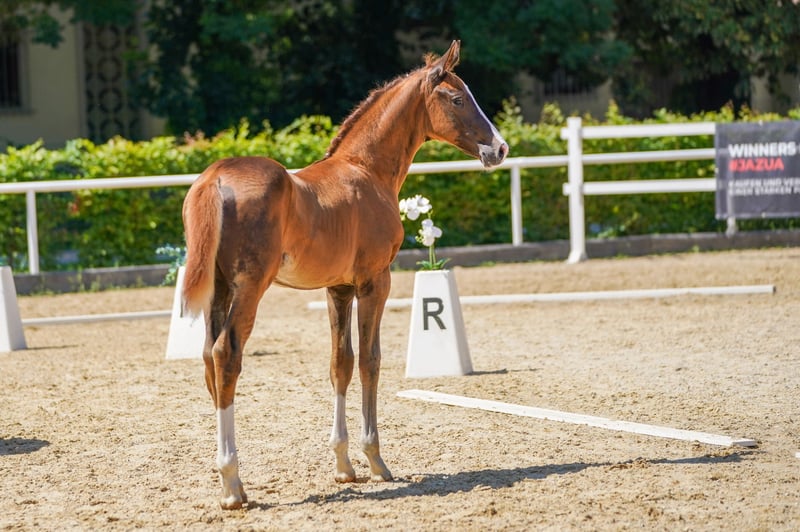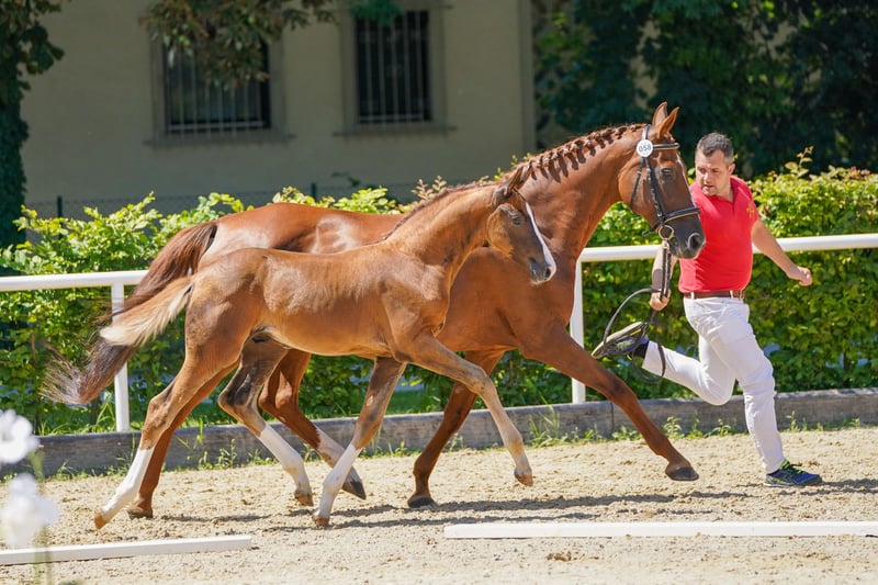 Our Skyfall - beautifully presented dark chestnut with three high white markings on his legs. Large-framed, harmoniously constructed with an elegant face, shows excellent basic gaits with a lot of thrust from the hindquarters. Knows the foal ABC, trailer, farrier, etc. From the mother, there are already successful dressage horses up to class S, and several offspring have been sold to stallion breeders.