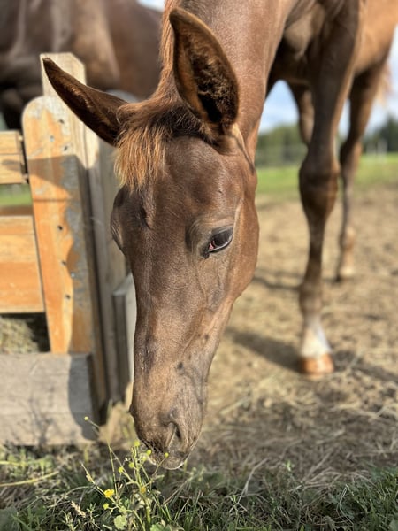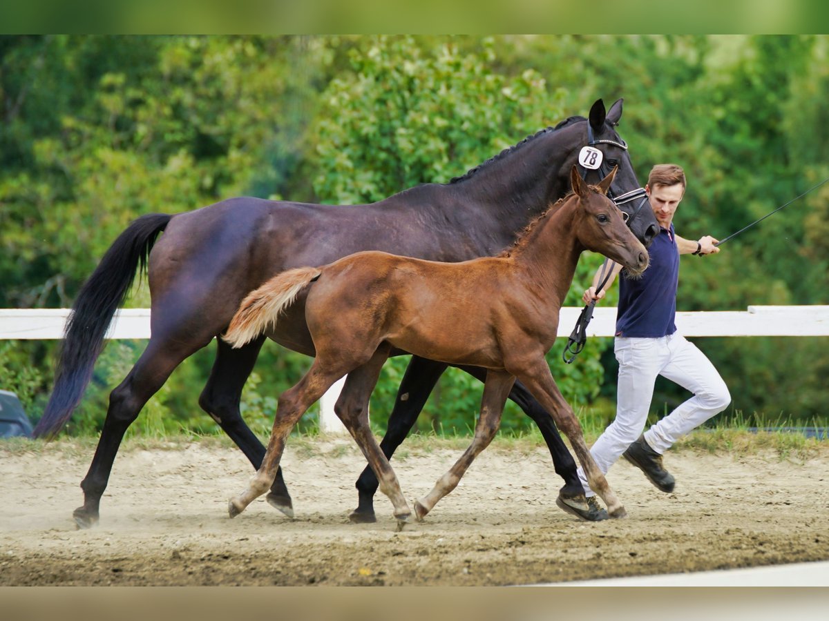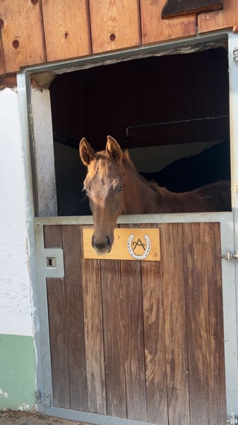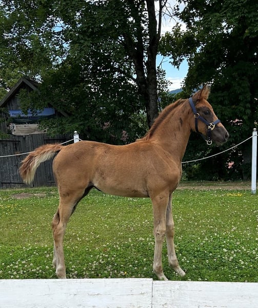 Malia LR, born on May 8, 2025, is a daughter of the young stallion Bon Esprit, the champion stallion of the Oldenburg licensing 2023, as well as the sport test winner 2024. Her mother Marcela is sired by the Olympic stallion Desperados FRH out of a proven Bolino mare. She has been successfully presented up to the LM class in dressage. Malia impresses with a correct foundation, promising application quality, and a people-oriented, clear character. At the Carinthian Foal Show, she was awarded as an elite foal with a score of 8.0. The dark chestnut foal is growing up in a species-appropriate environment in a herd. She is familiar with the foal ABC, is regularly dewormed, and shows herself to be curious, open-minded, and strong-nerved. Malia will only be placed in supportive, loving hands. A viewing is possible at any time by prior arrangement.