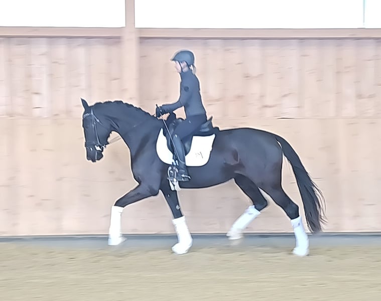 Donna Loranda ist eine qualitätsvolle Rappstute mit sehr gutem Hinterbein. Ihr Vollbruder ist aktueller Bundeschampion der 4 jährigen Reitpferde 2025. Der Stute steht in Punkto GGA und Einstellung alles offen. Lori ist sehr abgeklärt, nicht glotzig und vermittelt ein wunderbares Reitgefühl. Der Galopp ist hier ein absolutes Highlight. Die Stute ist im Herdenverband aufgewachsen und im Spätsommer 2025 von uns angeritten worden Ein sehr guter Röntgentüv von den Beinen liegt vor. Da es im Rücken einen Engstand gibt ( beeinträchtigt das Pferd 0.0) wird sie unter Wert angeboten. Klinisch o. B. Direkter Stutenstamm des Weltmeyer