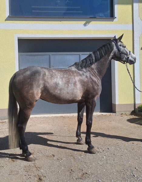 A bold and charismatic 8-year-old grey mare, perfect for the upcoming breeding season. She has already been victorious multiple times in show jumping classes at levels A and L (see Rimondo upon request). Due to a harmless splint bone fracture on the front right (no lameness to date), she is very well suited for breeding in the coming season. This is absolutely not a distress sale, more information available via private message. Please only inquire if seriously interested.
