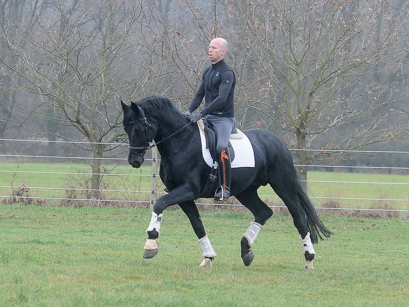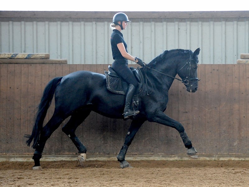 Cavallo stallone nero espressivo con ottimi passi di base e successo sportivo fino alla classe difficile. Fondamentalmente montabile e gestibile da chiunque. PER FAVORE SOLO RICHIESTE SERIE!!!