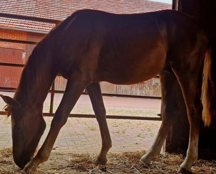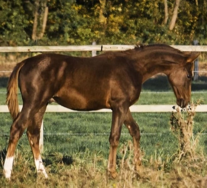 **Sales Advertisement: Dreamy Oldenburg Stallion** For sale is a promising Oldenburg stallion, born in 2024. With an elegant dark chestnut coat and a height of 163 cm, he is a true eye-catcher. This yearling stallion shows great potential in dressage and impresses with his quality of movement as well as his harmonious temperament. He is well-trained and incredibly people-oriented. Ideal for ambitious riders looking for a talented partner for the future. If you are interested or need further information, please feel free to contact me. Don't miss this opportunity!