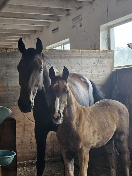 En raison d'une cessation d’élevage et d’un séjour à l’étranger, ce magnifique poulain entier, de la lignée BENICIO, est à vendre. Très bon mouvement, longiligne mais avec une ossature solide, élégant, correct et doté d’un grand charme, très confiant. Il deviendra grand, sa mère mesure 1,76 m, frère germain de 23 qui fait déjà 1,70 m. La mère est également à vendre, soit ensemble, soit séparément. Né en mai 2025, bai foncé. Sang Oldenburger, Stamm 74.