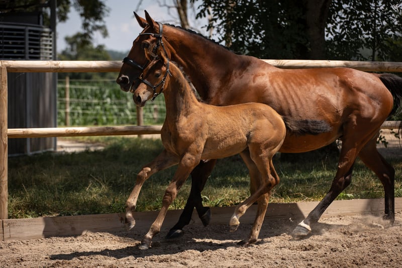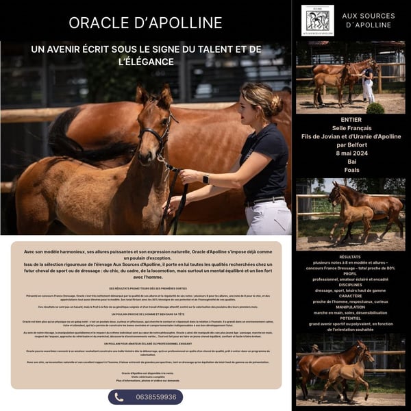 Un avenir écrit sous le signe du talent et de l’élégance ENTIER Selle Français Fils de Jovian et d'Uranie d'Apolline par Belfort 8 mai 2024 Bai Foals Résultats plusieurs notes à 8 en modèle et allures – concours France Dressage – total proche de 80% Profil professionnel, amateur éclairé et encadré Disciplines dressage, sport, loisirs haut de gamme Caractère proche de l’homme, respectueux, curieux manipulation marche en main, soins, désensibilisation Potentiel grand avenir sportif ou polyvalent, en fonction de l’orientation souhaitée Avec son modèle harmonieux, ses allures puissantes et son expression naturelle, Oracle d’Apolline s’impose déjà comme un poulain d’exception. Issu de la sélection rigoureuse de l’élevage Aux Sources d’Apolline, il porte en lui toutes les qualités recherchées chez un futur cheval de sport ou de dressage : du chic, du cadre, de la locomotion, mais surtout un mental équilibré et un lien fort avec l’homme. Des résultats prometteurs dès ses premières sorties Présenté en concours France Dressage, Oracle s’est très nettement démarqué par la qualité de ses allures et la régularité de ses notes : plusieurs 8 pour les allures, une note de 8 pour le chic, et des appréciations tout aussi élevées pour le modèle. Son total flirtant avec les 80% témoigne de son potentiel et de l’homogénéité de ses qualités. Ces résultats ne sont pas un hasard, mais le fruit à la fois de sa génétique soignée et d’un travail d’élevage attentif, centré sur la valorisation des poulains dès leurs premiers mois. Un poulain proche de l’homme et bien dans sa tête Oracle est bien plus qu’un physique ou un galop noté : c’est un poulain doux, curieux et affectueux, qui cherche le contact et s’épanouit dans la relation à l’humain. Il a grandi dans un environnement calme, riche et stimulant, qui lui a permis de construire les bases mentales et comportementales indispensables à son bon développement futur. Au sein de notre élevage, la manipulation quotidienne et le respect du rythme individuel sont au cœur de notre philosophie. Oracle a ainsi été manipulé dès son plus jeune âge : pansage, marche en main, respect de l’espace, approche du vétérinaire et du maréchal, découverte d’environnements variés… Tout est fait pour en faire un jeune cheval équilibré, confiant et facile à faire évoluer. Un poulain pour amateur éclairé ou professionnel exigeant Oracle pourra aussi bien convenir à un amateur souhaitant construire une belle histoire dès le débourrage, qu’à un professionnel en quête d’un cheval de qualité, prêt à entrer dans un programme de valorisation. Avec son chic, sa locomotion naturelle et son excellent rapport à l’homme, il laisse entrevoir de grandes perspectives, tant en dressage qu’en équitation de loisir haut de gamme ou de présentation. Oracle d’Apolline est disponible à la vente. Visite vétérinaire complète Plus d’informations, photos et vidéos sur demande.