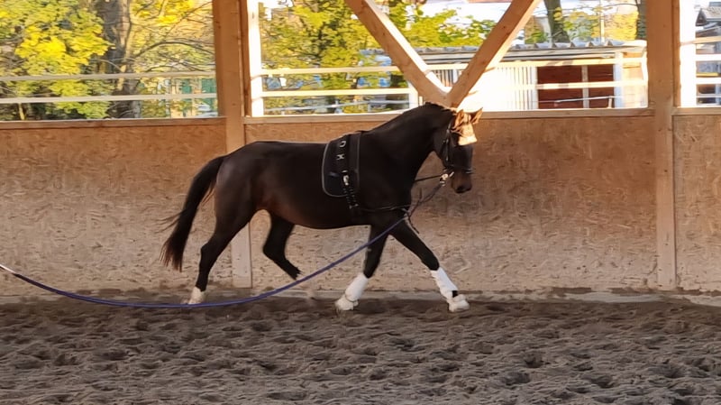 Este joven caballo de doma en desarrollo, de color castaño oscuro, nació el 15 de junio de 2023. Se mueve con mucha soltura por todo el cuerpo, con una base sólida y bien formada. Tiene tres aires básicos muy buenos, con mucha elasticidad, amplitud, ritmo y cadencia. Es muy dócil y, acorde a su edad, ya está siendo trabajado en longe. Hemos decidido no presentarlo aún para la selección de sementales, ya que todavía es muy joven y necesita algo más de tiempo para desarrollarse. Crece en nuestro establo activo, en una manada de 20 caballos compuesta por potros, caballos en edad adulta y caballos retirados, por lo que está muy bien socializado. Estimamos que su tamaño final será de aproximadamente 1,70 m. Se vende a causa de una reducción de la cabaña, a manos de criadores que puedan potenciar su desarrollo. También puede quedarse con nosotros para continuar su cría o incluso para su entrenamiento. Opcionalmente, puede ser castrado si se desea. No dispone aún de un informe de aptitud veterinaria (AKU) ni radiografías, pero puede realizarlas si se requiere.
