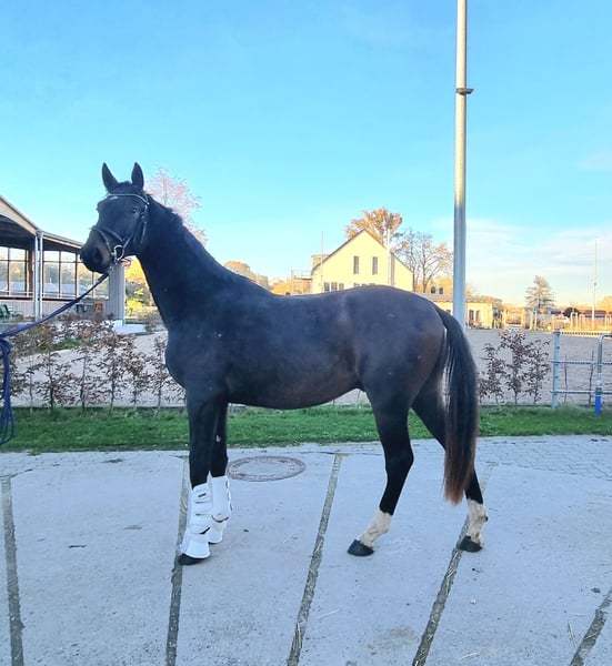 This young dark bay stallion, still in development, was born on June 15, 2023. He moves very freely through his body, with a solid and well-structured foundation. He has three very good basic gaits, characterized by elasticity, scope, and rhythm. He is very friendly and has been lunged appropriately for his age. We have decided not to present him for licensing yet, as he is still very young and needs a bit more time to develop. He is raised with us in an active herd of 20 horses, consisting of geldings and stallions, from yearling to pensioner, ensuring excellent socialization. We estimate his final height to be around 170 cm. Due to herd reduction, he is being sold into good, supportive hands from a breeder. He can also stay with us for further growth and development, including starting under saddle if desired. Kastration can be arranged upon request. No ultrasound or X-ray examinations are available yet but can be performed if needed.