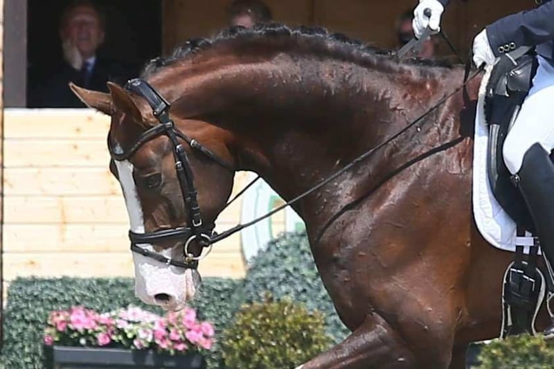 A Dream Stallion in Choccofuchs with plenty of white Born in 2017, standing at 17.4 hands, he is a multiple-winning M-level dressage horse and has achieved S-level placings. Riding him is a true pleasure. He delivers powerful impulsion from behind, and all three basic gaits are outstanding. He exhibits excellent rhythm, suppleness, uphill tendency, lightness, and an exceptional character. As a stallion, he is very easy to handle and completely well-behaved, even at competitions.