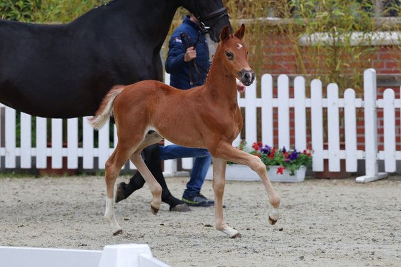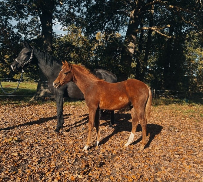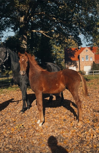 Verbandsprämiertes Oldenburger Hengstfohlen von Le Formidable aus einer Hauptprämienstute von Desperado x Florencio I x Feiner Stern x Figaro x Kronprinz Unser typvolles Hengstfohlen in herrlicher Dunkelfuchsjacke aus dem Stamm der Irnanda sucht noch ein neues Zuhause!! Ein sehr edles Fohlen, schön im Genick und mit 3 guten Grundgangarten (speziell auch einem sehr guten Schritt) und viel Schub aus dem Hinterbein ausgestattet. Er ist sehr entspannt und brav im Umgang, regelmäßig entwurmt und dem Schmied vorgestellt. Durch das Bauernhofleben bei uns kennt er Trecker, Kühe, Hunde, viele Kinder usw. Da unser anderes Hengstfohlen Anfang November auszieht, suchen wir für ihn noch ein liebevolles Zuhause! Wir möchten ihn ungern allein aufziehen. Er wird demnach gemeinsam mit seinem Kumpel Anfang November abgesetzt und kann dann ebenfalls umziehen. Es gilt daher Platz vor Preis!! Anfragen vorzugsweise telefonisch!