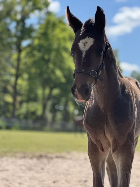 Nino S ist ein schicker groß werdender am 12.04.2025 geborener Hengst. Er stammt ab von Newmarket ( Chacoon Blue x Numero Uno x Carthago) aus einer Quintender x Landjonker Mutter. Nino kennt das Fohlen ABC, ist frisch abgesetzt und wächst im Herdenverband mit anderen Hengst-u. Stutfohlen auf. Grundsätzlich besteht bei Interesse die Möglichkeit, dass er die Aufzucht über bei uns und seinen Kumpels zu bleiben( auch als Hengst). Seine Mutter habe ich von ihrer Züchterin übernommen und sie bis M-Springen vorgestellt. Leider hat sie sich in der Box beim wälzen verletzt (mit dem Hinterfuß unter der Boxentür her getreten und festgehangen), weshalb wir sie nach dem Heilungsprozess in die Zucht nahmen und nicht wieder im Sport eingesetzt haben. Unter dem Sattel überzeugte sie mit leistungswillen, Mut, Vermögen, Vorsicht und Ergeiz, wie guter Rittigkeit, welches sie bislang an ihre Nachkommen und ihre erste Enkelin weiter gibt. Ihre erste Tochter ist nun 6jährig. Sie hatte 4j. bereits ein Fohlen und ist nun bis M-Springen erfolgreich und wir blicken mit Spannung und Vorfreude auf das nächste Jahr. Bislang hat sich Nino‘s Mutter immer sehr groß vererbt (175-180cm), daher gehen wir davon aus, das auch er groß wird. Trotz der Größe waren seine Geschwister bislang alle immer sehr rittig, einfach zu reiten und vom Typ geschlossene Pferde. Eingetragen wird er bei einem Sammeltermin bei uns am Hof im Oldenburger Springpferde Verband, da auch hier seine Mutter eingetragen ist und unsere anderen Fohlen eingetragen werden. Ein kennenlernen ist jederzeit möglich.