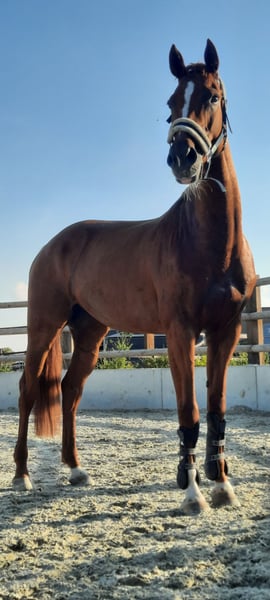 C Trentina, sire C-Trenton Z / dam's sire Landor S is a stylish Oldenburg chestnut mare, born in 2014. She has a height of 164 cm and shows great potential in show jumping. Overall, she is very versatile and talented. She impresses with her gentle nature and willingness to please. She has competition experience up to 115 cm (training up to 135 cm), is loading-friendly, farrier-friendly, and can go both alone and with company in the terrain. She has no bad habits such as rushing, bucking, or rearing, but is quite spirited and requires a confident rider who can handle a sensitive horse, as she can be somewhat spooky. She has no health issues and has never suffered from injuries with lasting effects. She has been regularly treated by osteopaths and chiropractors and has also undergone regular magnetic field therapy. The mare is prone to head-shaking and exhibits a strong toe-in gait in the hind legs, which causes her hock to rotate outward when walking. However, this does not cause her any health problems, limit her or require special treatment. Due to these two aspects, the price is negotiable.