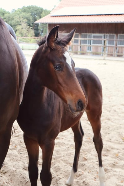 Jabaluna, this modern and typy filly combines international top bloodlines with proven sport performance on the maternal side. Sire: Jasper (Heartbreaker x Darco x Ramiro Z) Jasper himself was successful internationally up to 1.60 m and participated in the Global Champions Tour, among others. With heart, caution, and ability, he influenced both his sport performances and his offspring. His pedigree is a sporting accolade: Heartbreaker – one of the most influential stallions worldwide in breeding and sport. Darco – Olympic horse and line founder, known for strength and attitude. Ramiro Z – one of the most significant breeding legends in warmblood breeding. Dam: Cadenta (Cantolar x Cardento x Zeus) The dam Cadenta was able to impress in sport herself before a pasture accident ended her career prematurely: Victories up to A-level show jumping (A**), Placings in L-level show jumping, very promising for the higher classes. Through Cardento and Zeus, the maternal line is additionally well secured. Exterior & Movement Modern, blood-typed sport model with correct foundation. Expressive, with a harmonious top line. Strong movement, especially with an elastic, uphill-carrying canter. Character People-oriented and friendly, curious in daily handling. Perspective A foal with all the qualities for international show jumping – and at the same time interesting for breeding, thanks to the double security provided by a successful dam and a top pedigree on the sire's side.