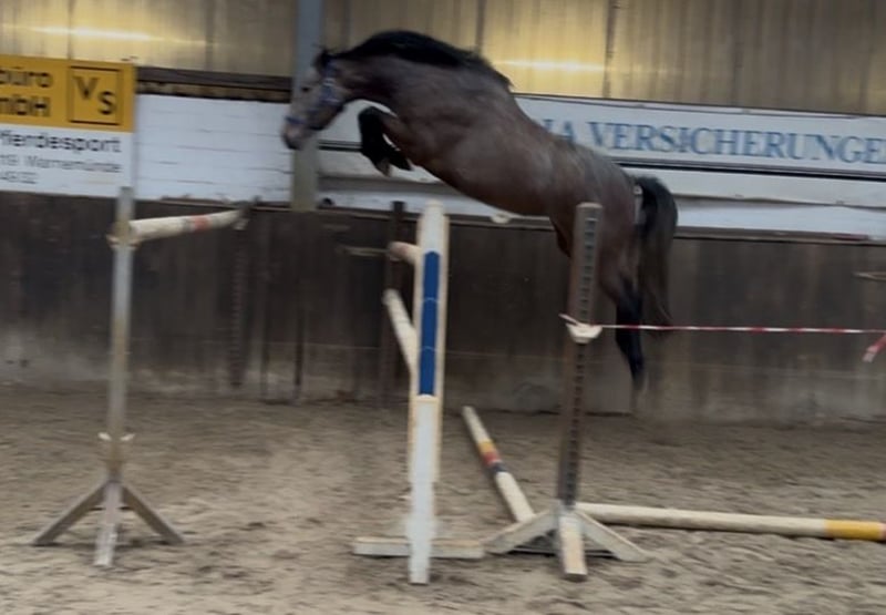 Zeer veelbelovend met enorm veel potentieel en voorzichtigheid bij het springen toont onze zelfgefokte 4-jarige merrie, een volle zus van Vivant. Bij interesse zijn wij graag bereikbaar op 01742020310 (Jörg Möller).