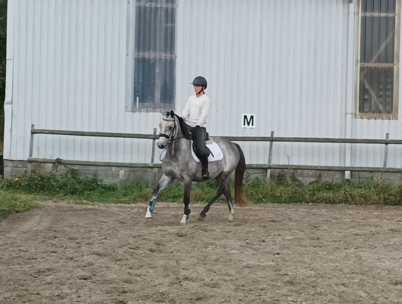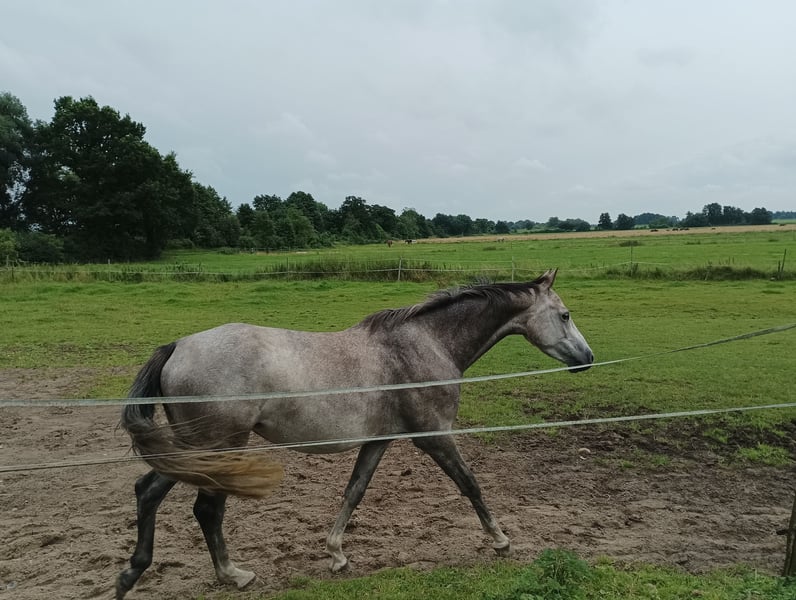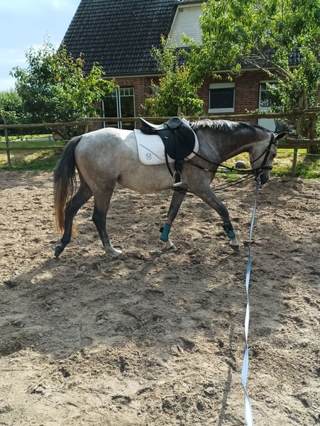 With a heavy heart for sale: Flame Corazon is my first homebred filly, approximately 148cm tall and now 4 years old. She is currently being backed. Flämmchen is a curious, playful but totally sweet and well-mannered mare. She is blacksmith-friendly. Loading is currently being practiced. In the riding photo, she is being ridden freely in the large arena for the third time. She has very good gaits and makes a nice jump. Her mother is Fijara Grace, a Holsteiner by Corrado I x Caretino, and her father is Casino Grande, an Oldenburg by Casino Berlin x Contakt Me. She is only for sale because she has remained too small for me. Not suitable for breeding. No urgent sale and no dealers!