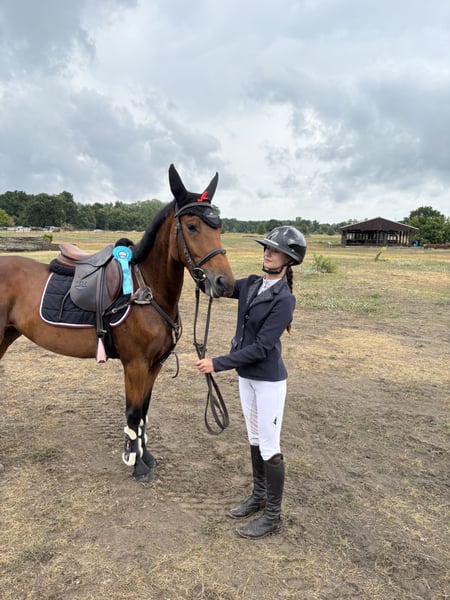 For sale a young pony with the potential and quality for the highest level. Checky has been in training for a year (with us). She has already won the 90cm competition and successfully started competing in the 1m class. She has a wonderful jumping technique with a large gallop. Her full pedigree includes horses up to 1.60m level! She is not suitable for beginners, as she is soft in her mouth and is afraid of horses during warm-up. She jumps everything, easily goes to the horsetruck, rides in the forest, and spends time in the paddock daily. She has excellent X-rays from two years ago. If you are experienced and are looking for a young pony to develop with the potential to compete in European Pony Championships, Checky is the right choice. She is located in Poland, 3h from Berlin. I'd be happy to send you videos via WhatsApp; they're too long to post here: +48693895779