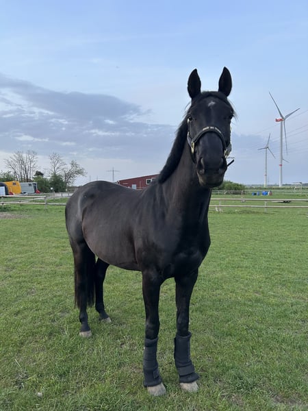 Schweren Herzens suche ich ein gutes Zuhause für meine fast 9 jährige Oldenburger Springpferde Rappstute (168cm). Namira kam im August 2022 als Problempferd zu mir. Da ihre vorherige Ausbildung offensichtlich nicht auf ihre Bedürfnisse angepasst worden ist, habe ich damals bei 0 neu angefangen. In den letzten 3,5 Jahren haben wir den Fokus fast ausschließlich auf den Umgang im Alltag, der Boden-,Longen-und Freiarbeit gelegt. Mit dem Ergebnis, dass sie sehr fein und leicht-aber bestimmt zu Händeln ist. Dabei arbeitet sie sehr motiviert und eifrig mit und will gefallen. Ich habe sie damals mit dem Status „angeritten“ übernommen, welchen wir erst im letzten Jahr wieder aufgegriffen haben. Hierbei zeigte sie sich zunächst unbeeindruckt, was sie aber bis zum heutigen Zeitpunkt nicht weiter fortführen konnte. Trotz verschiedener Trainingsansätze ist es uns noch nicht gelungen, ihr die Ruhe und Sicherheit von oben genau so zu vermitteln, wie vom Boden aus. Sie ist keineswegs bösartig, aber die Kompetenzen von mir und dem Team um sie herum, hören hier auf. Gesundheitlich gibt es keine Auffälligkeiten die ihr Verhalten, nur mit Reiter drauf, erklären würden (Mehr dazu im persönlichen Gespräch). Namira ist eine sensible und feine Stute, die das Herz absolut am rechten Fleck hat. Sie behält gern den Überblick und ist in unbekannten Situationen teils unsicher und schreckhaft, aber händelbar. Fühlt sie sich jedoch wohl, schmust sie gern und ist ein richtiger Clown, der einem zum Lachen bringt. Sie ist trotz der feinen Ausbildung am Boden, kein Anfängerpferd. Ich suche für sie ein Zuhause, in dem ihr die Zeit und Rücksicht gegeben wird, die sie braucht, welche ich ihr aufgrund von beruflicher Veränderung leider nicht mehr geben kann, trotz jeglicher Abwägung. Sie wird nur in eine artgerechte Haltung mit viel Auslauf und kleinem Herdenverbund abgegeben. Ich kann sie mir ebenfalls als gesunden Beisteller vorstellen, welcher vom Boden aus Freude macht und wo das Reiten nicht im Fokus liegt. Vielleicht wäre auch die Zucht eine Option. Sie ist geimpft, entwurmt und Barhufer. Händler und Schulbetriebe sind ausgeschlossen. Platz vor Preis hat höchste Priorität, da es mir wichtiger ist, dass sie ein Zuhause findet, in dem sie trotz ihrer Vorgeschichte und einhergehenden Probleme geschätzt und geliebt werden darf.