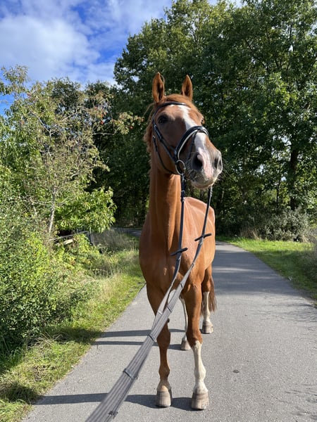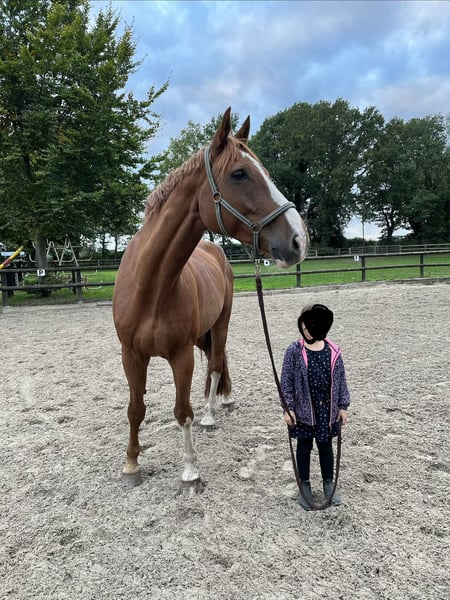 Chuck ha 16 anni e un'altezza di 185 cm. Da ormai non riesco più a dedicargli il tempo e l’attenzione che meriterebbe, soprattutto dopo la gravidanza e la nascita di mio figlio, cerco per lui una nuova casa. Chuck è un cavallo molto dolce, quasi sempre calmo. Quando qualcosa non gli piace (come le nuove scuderie di lavaggio, le porte strette...) o quando vede qualcosa di nuovo, si ferma e non si muove finché non si sente sicuro. In presenza di vento e pioggia può diventare qualche volta un po’ irrequieto a mano, ma sotto sella rimane tranquillo. A 5 anni è stato acquistato dal mio ex club come cavallo di volteggio e addestrato per una squadra L/M*, con cui ha gareggiato fino al 2022. Durante questo periodo, il suo ginocchio è stato trattato due volte con cortisone, dopodiché si è deciso che non fosse più adatto per il salto in carriera. L’ho preso io in gestione. Il suo ginocchio è stato trattato cinque volte con IRAP. Da allora, viene esercitato con esercizi di ginnastica, lunghe passeggiate al passo e qualche lavoro sotto sella. Priorità al buon posto, non al prezzo.