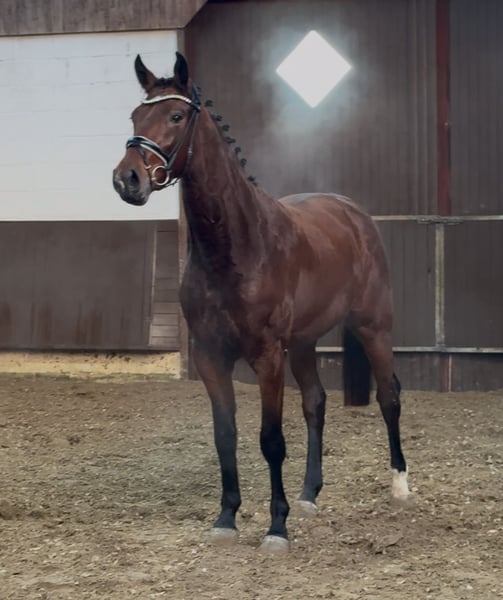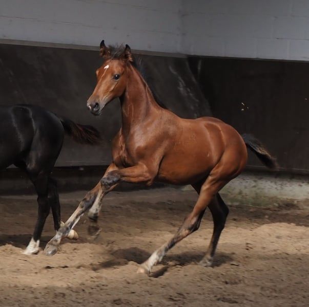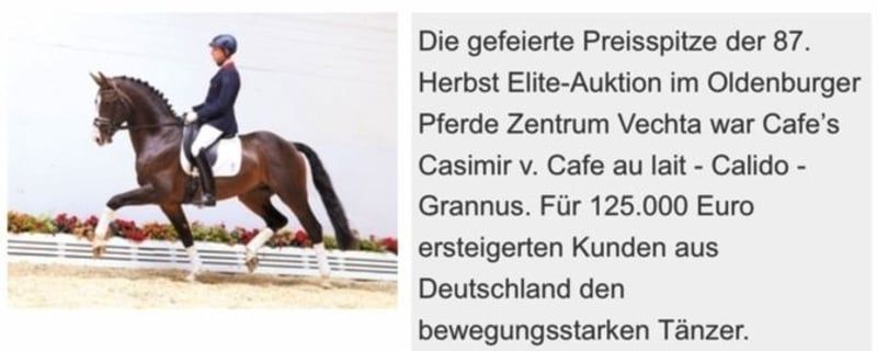 Diese typvolle früh geborene Stute überzeugt durch ihre Qualität und die äußerst interessanter Blutführung für den Dressur- und Springsport gleichermaßen! Ihr gekörter Vollbruder absolvierte grade seinen 50 Tage Test mit Noten bis 9,0! Vater "Cafe au lait", Körsieger, HLP-Sieger und BuCha Finalist, machte sich die letzten Jahre einen Namen durch seine äußerst erfolgreiche Nachzucht im Dressur- und Springsport der schweren Klasse gleichermaßen. So wurde Cafe's Casimir" (Cafe au lait x Calido x Grannus) gefeierte Preisspitze der Oldenburger Eliteauktion, ist bereits in jungen Jahren Seriensieger in S- Dressuren und international Intermediaire I siegreich. Stute Kasselmanns Cafe's Caletta (Cafe au lait x Calato) ist ebenfalls bereits S-Dressur platziert und international Grand Prix siegreich. Cafe's Mats (Cafe au lait x Don Frederico) wurde zweitteuerstes Dressurpferd der Oldenburger Summer Mixed Sales. Weitere Jungpferde aus springbetonten Mutterstuten sind bereits mehrfach in Dressurpferdeprüfungen A bis M platziert und sind bemerkenswert bewegungsstark und kopfklar. Dass die Cafe au lait Nachkommen im Springsport bis zur schweren Klasse überzeugen steht außer Frage. So wurde der gekörte Cafe's Champus unter Rene Tebbel Vizeweltmeister der jungen Pferde und steht ebenfalls bei uns im Deckeinsatz. Ebenfalls gekört und aus unserer Zucht: Cafe Junior (Cafe au lait x Silvio I), international S*-Springen platziert. Cafe's Columbo (Cafe au lait x Belstaff) : sporterfolgreich in Frankreich. .Cafe's Don Rubin: gekört, 4jährig als jüngstes Pferd Bronze beim Dobrocker Deisterchampionat. Jetzt 5jährig mehrfach siegreich in Springpferde L, M platziert und qualifiziert zum BuCha Cafe`s Deconi: gekört, grade 3jährig 50 Tage Leistungsprüfung mit Noten bis 9,0 abgelegt! Stationiert bei Paul Schockemöhle zeugte Cafe au lait schon etliche international erfolgreiche Springpferde, u.a. "Royce", siegreich im FEI CSI5* $500,000 Rolex Grand Prix Wellington. Cafe au lait selbst war unter Philipp Weishaupt Bundeschampionatsfinalist und ist bis S*** Springen erfolgreich gewesen, ist aber auch mit drei überzeugenden GGA ausgestattet und dressurmäßig auf S Niveau ausgebildet worden. Unsere Fohlen bekommen täglich Mineralfutter und Fohlenstarter, regelmäßig EQUISTRO Haemolytan und Ipaligo Foal, Wurmkuren und Schmied sind natürlich ebenfalls selbstverständlich. Auch die Muttertiere bekommen die ganze Trächtigkeit hindurch spezielles Stutenfutter, täglich Saftfutter und Leinöl, sowie Heu ad libitum. So ist unsere Nachzucht stets im besten Gesundheitszustand! Es stehen auch immer wieder einige tragende Zuchtstuten zum Verkauf, ein Teil ist unter den weiteren Anzeigen zu finden. Bei passenden Pedigree Inzahlungnahme von Zuchtstuten möglich. Videoanfragen ausschließlich vorab via WhatsApp möglich. Cafe`s Devina verfügt bereits über aktuelle sehr gute Röntgenbilder