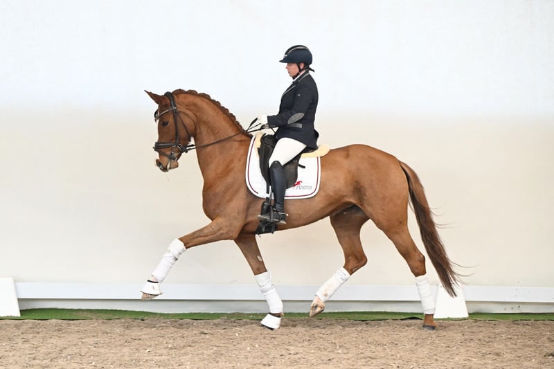 Juna Jackpot, una cavalla di cinque anni con un tipo di cavallo sportivo moderno, incanta con potenza, eleganza e presenza naturale. Costruita con un profilo uphill, presenta andature elastiche e fluide, e un trotto ampio e uphill con un portamento elevato, combinando raffinatezza nobile a un aspetto impressionante. Il suo carattere sincero e amichevole la rende una cavalla che colpisce sia sotto la sella che a terra. Il suo pedigree riflette il meglio dell’allevamento moderno per il dressage: il suo stallone sire Janeiro Platinum trasmette eleganza, raffinatezza e movimenti eccezionali ai suoi figli. Il suo damsire Londontime, leggendario stallone Hannoveriano e stallone di stallone statale a Celle, contribuisce con facilità di maneggevolezza, desiderio di collaborare e numerosi progenie di livello S. La linea materna è ulteriormente rafforzata da Weltmeyer, uno dei stalloni di dressage più influenti al mondo, noto per meccaniche eccezionali, facilità di conduzione e un potente posteriore. Juna Jackpot si presenta come una cavalla armoniosa, desiderosa di imparare, con autoportanza naturale, movimento uphill e andature espressive. Una giovane cavalla che impressiona per carattere, qualità del movimento e raffinatezza – pronta a svilupparsi in una partner di dressage eccezionale.