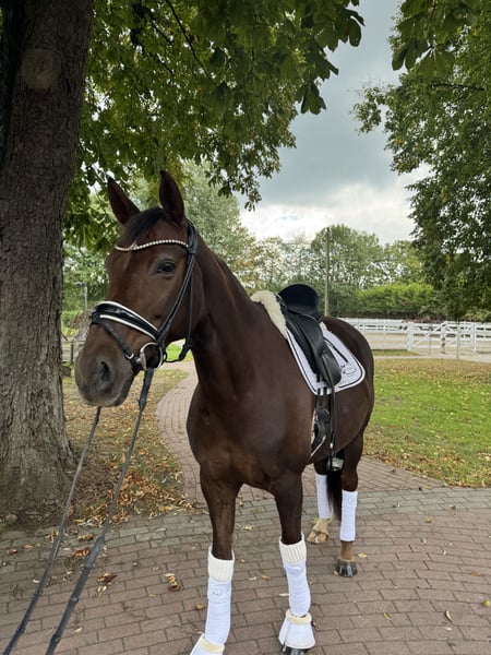 Bildschöne Dunkelfuchsstute *2019 1,67m groß La Vie x Don Romantic Aufgrund von Zeitmangel sucht Cleo ein neues 5* Zuhause. Sowohl im Umgang als auch beim Reiten sehr brav und bis Dressurpferde M Niveau ausgebildet, Wechsel allerdings noch etwas grün. Das Video ist im Training entstanden und nur ein kleiner Zusammenschnitt, dabei trägt sie zum ersten Mal eine Kandare. Ist auf Trense problemlos zu reiten. Gute Röntgenbilder aus Dez inkl. Hals und Rücken vorhanden. Für mehr Informationen und Videos bitte Nachricht/ Anruf an +49 1721636835