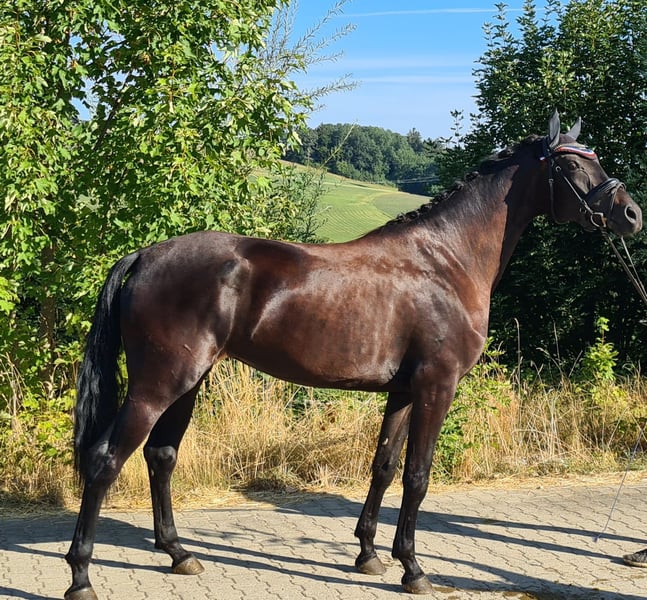 Esta gran yegua de patas largas y cara bonita viene directamente del criador. 3 aires superiores. Interior tranquilo. En el campeonato de paso libre obtuvo 9 en paso, 8,6 en trote y 8,8 en galope. Absolutamente educado y manejable bajo silla. 3 salidas victoriosas en doma de nivel principiante. Actualmente tiene una potra top de Zardando (Tango x Gribaldi x Contango) al pie y será montada de nuevo a partir de otoño.