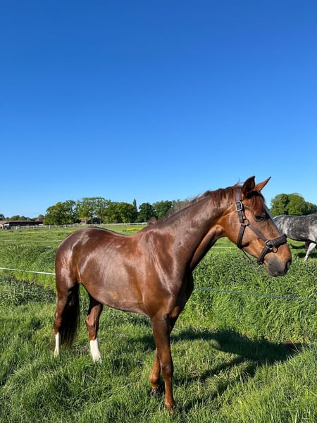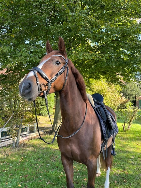 Wir verkaufen unsere Stute, die wir dreijährig direkt vom Züchter roh gekauft haben. Die Stute kannte damals noch nichts und wurde anschließend schonend eingeritten und weiter ausgebildet. Sie ist turniererfahren und zeigt sich dort genauso brav wie zu Hause. Man kann mit ihr problemlos alleine ausreiten. Sie ist doppelt veranlagt für Dressur und Springen. In der Dressur lässt sie sich fein und angenehm reiten. Im Umgang ist sie unkompliziert und menschenbezogen. Leider hatte sie eine Sehnenverletzung, die noch nicht vollständig ausgeheilt ist. Deshalb verkaufen wir sie deutlich unter Wert. Die Halbgeschwister unserer Stute sind züchterisch hoch erfolgreich und wurden bis zum Brillantring sowie als Staatsprämienstuten prämiert. Wir wünschen uns für sie einen Platz mit Geduld und Sachverstand, an dem man ihr die nötige Zeit gibt.