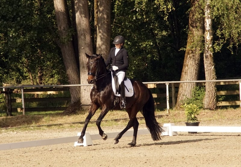 This stunning, compact mare captivates with her expressive appearance and three equally good basic gaits. She is trained up to level M. An excellent prospect for both ambitious dressage riders and for daily, joyful work at home. She presents herself with a pleasantly balanced temperament, is neither spooky nor nervy, and impresses with her calm demeanor combined with willingness and effort. Additionally, she is very seat-friendly and provides the rider with a secure, harmonious feeling. With her special charm and presence, she is a real eye-catcher – a horse to fall in love with, with sporting potential. She comes directly from the breeder and has been lovingly and well cared for during her upbringing. She has only known positive experiences. Her close bond with humans is clearly noticeable. A current, valid health certificate is available. Of course, she is shoe- and loading-friendly. Further information gladly upon request.