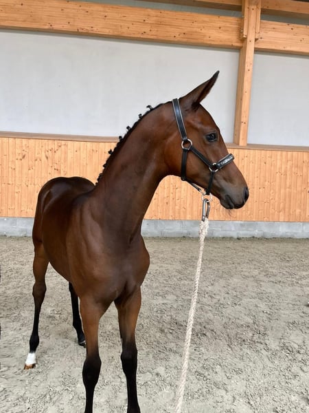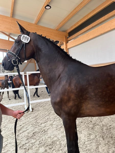 Chanel is a highly modern broodmare by the highly successful Franziskus, who has been multiple times placed internationally under Ingrid Klimke. The mare is in excellent health, free of vices, and shares pasture with other mares. She is familiar with the farrier, trailer loading, and has been presented for licensing. Chanel was backed at age four and subsequently entered into breeding soundly. Therefore, she is being sold as a broodmare, not as a riding horse. The video shows her elite foal by Total Diamond, which was approved for the auction. All of her foals have been either awarded premiums or registered as elite foals. Her full brother, Fortyfive aka Franzel, was sold through the Vechta auction and is successfully competing up to Grand Prix. A recent short video can be sent upon request. Viewing possible by arrangement. Chanel was not bred in 2025 due to personal circumstances. Available only to knowledgeable breeders who will appreciate her potential.