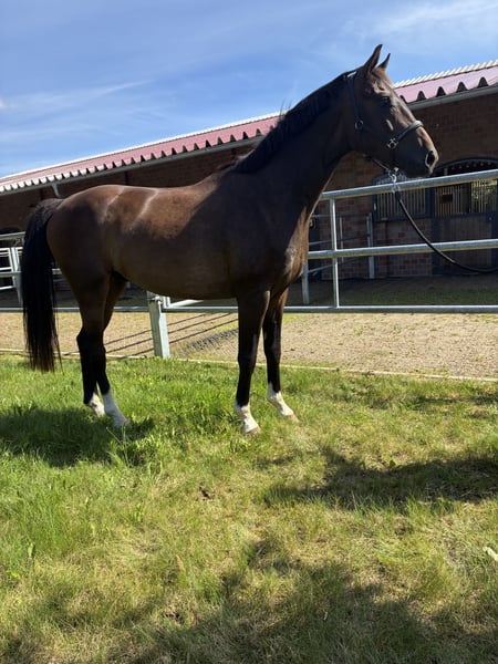 With Sir Romanov, we offer a 2-year-old gelding from one of the best dam lines in Oldenburg. His mother Florell was a 1d Brilliant Ring mare at Rastede with an excellent SLP. She produced the Westphalian premium stallion Fürst Romanov in combination with First Choice, who is now successfully competing at Grand Prix level in the USA. His grandmother Fiesta's Girl has produced several licensed and successful sport stallions and is a full sister to Don Schufro. Sir Romanov was awarded as a foal, stands in a medium frame on very correct foundations with three very good basic gaits. He comes from our breeding, has grown up in a herd environment, but has always been handled, regularly seen by the farrier, dewormed, and vaccinated. He is sold directly from the farm. No X-ray images available. For more information, please feel free to contact us at 01749049299.