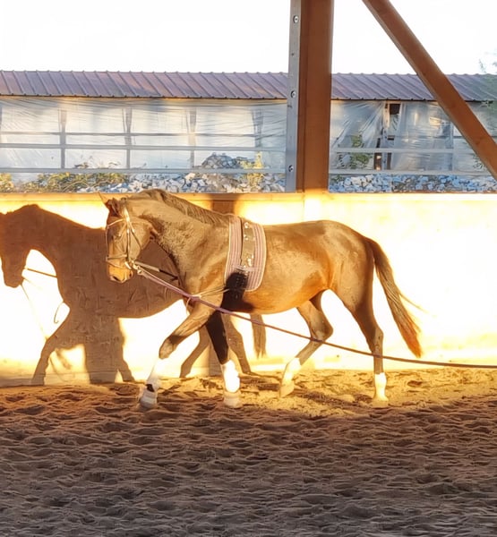 Este joven caballo de doma en desarrollo, de color castaño oscuro, nació el 15 de junio de 2023. Se mueve con mucha soltura por todo el cuerpo, con una base sólida y bien formada. Tiene tres aires básicos muy buenos, con mucha elasticidad, amplitud, ritmo y cadencia. Es muy dócil y, acorde a su edad, ya está siendo trabajado en longe. Hemos decidido no presentarlo aún para la selección de sementales, ya que todavía es muy joven y necesita algo más de tiempo para desarrollarse. Crece en nuestro establo activo, en una manada de 20 caballos compuesta por potros, caballos en edad adulta y caballos retirados, por lo que está muy bien socializado. Estimamos que su tamaño final será de aproximadamente 1,70 m. Se vende a causa de una reducción de la cabaña, a manos de criadores que puedan potenciar su desarrollo. También puede quedarse con nosotros para continuar su cría o incluso para su entrenamiento. Opcionalmente, puede ser castrado si se desea. No dispone aún de un informe de aptitud veterinaria (AKU) ni radiografías, pero puede realizarlas si se requiere.