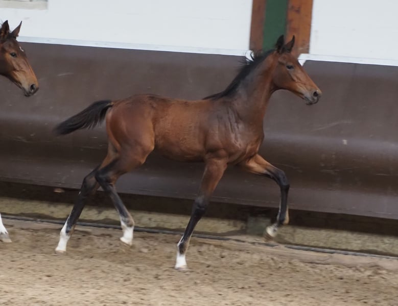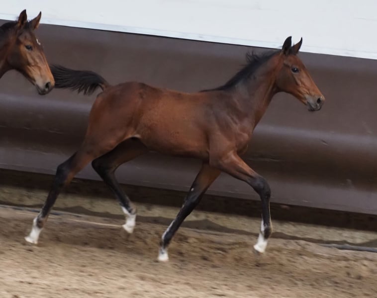 Noble, long-legged and typey 1.5-year-old stallion prospect with lots of movement quality! With Cafe au lait as his sire and Quattro B on the dam's side (MMV), he is doubly secured for dressage and show jumping alike. Licensed, HLP winner and BuCha finalist "Cafe au lait" has already produced a large number of internationally successful show jumping and dressage horses. One of the few sires who can boast a number of successful offspring in both disciplines up to advanced level! Cafe au lait himself was a Bundeschampionat finalist under Philipp Weishaupt and has been successful up to advanced (S***) level in show jumping, but also has three spectacular gaits and has been trained to advanced (S) level in dressage. Stationed with Paul Schockemöhle, he has already sired a number of internationally successful show jumpers, including "Royce", victorious in the FEI CSI5* $500,000 Rolex Grand Prix Wellington. The licensed Cafe's Champus was Vice World Champion of the young horses under Rene Tebbel. Also licensed and bred by us: Cafe Junior (Cafe au lait x Silvio I), placed internationally in advanced (S*) level show jumping competitions. Other young horses out of jumping-oriented dams have already placed several times in tests for young dressage horses from novice to medium level and are remarkably strong-moving and clear-headed. The "Cafe's" also impress across the board in the big arena: Cafe's "Casimir" (Cafe au lait x Calido x Grannus) was the celebrated top prize winner at the Oldenburg Elite Auction, was a series winner in medium (M) level dressage horses at a young age, and was a series winner again in his first advanced (S) level dressage tests as a 7-year-old! He is now victorious in international Intermediaire I classes. Kasselmann's mare Cafe's Caletta (Cafe au lait x Calato) has also already won advanced (S) level dressage and international Grand Prix. Cafe's Matts (Cafe au lait x Don Frederico) was the second most expensive dressage horse at the Oldenburg Summer Mixed Sales. Our foals receive daily mineral feed and foal starter, regular EQUISTRO Haemolytan and Ipaligo Foal, worming and a farrier are also a matter of course. The dams also receive special mare feed throughout their pregnancy, daily juice feed and linseed oil, as well as hay ad libitum. This ensures that our offspring are always in the best of health! Further foals and offspring from our own breeding on request. A small selection can be found under the other advertisements. We produce around 20 cafe au lait foals every year. Trade-in of suitable broodmares possible. There are always a few broodmares in foal for sale. Video inquiries only possible via WhatsApp.