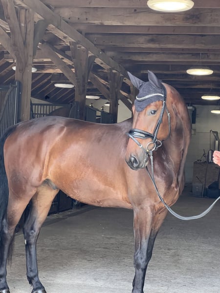 This young Oldenburg not only impresses with his conformation and an excellent height of 1.73 m, but also with his reliable character and clear talent for dressage sport. Already confidently working in all basic gaits, he shows very good rideability: safe and friendly, while at the same time carrying enough positive energy and willingness to develop into a first-class competition horse. His bloodline speaks for itself: Escolar – one of the most sought-after sires in modern dressage breeding, known for power, elasticity, and outstanding rideability – combined with Rohdiamant, a proven elite stallion who passes on elegance, type, and a trustworthy temperament. An ideal partner for ambitious amateurs as well as professionals with high sporting ambitions.