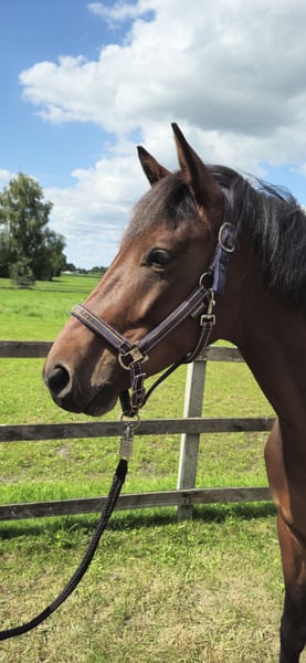For sale is this beautiful 5-year-old gelding by Estobar NRW × Rubino Rosso × Pik Bube II. Easy has been under saddle for about 1 year. He impresses everyone with his super calm, relaxed character and great work ethic. This makes him a fantastic horse for transitioning riders. He has a height of approximately 164 cm. I myself am 183 cm tall, and as you can see, he covers the height well. He is familiar with unfamiliar riding arenas, short trail rides, light pole work, as well as loading and the farrier. If interested or for further questions, please feel free to contact me.