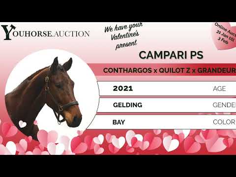 https://youhorse.auction/en/auction/Campari-PS-CONTHARGOS-x-QUILOT A horse showing scope, canter and quality Campari PS is a horse that clearly shows scope. He has a big canter and displays a lot of quality over the jump, with a good hind-end technique. He can trot very spaciously and canters clearly uphill. A very nice model with a correct and attractive type. Coming from a very strong damline and overall a horse with presence and quality. Sire Conthargos (Converter I x Carthago Z) competed himself at 1.35m level and is one of the most influential modern showjumping sires. He is licensed with Holstein, Oldenburg and SF. Conthargos is known for passing on scope, canter and attitude and has produced many international jumpers, including Cocolina (1.70m), Concona (1.65m) and Conthargo-Blue (1.65m). Damline The dam is Quilavda Z (Quilot Z), descending from an exceptionally strong and deep performance family. Quilot Z competed at 1.50m level and carries proven Grand Prix genetics through Quick Star. This damline has produced a large number of international showjumpers: – Calavda Z (Calvaro Z), international 1.60m – Caivano 3 (Chacco-Blue), international 1.60m, CSIO level – Chaquilot (Chacco-Blue), international 1.60m, CSI5* winner – Calvilot (Calvaro Z), international 1.60m, Nations Cup Final – Chacolvido PS (Chacoon Blue), winner at 1.45m level – Elisa BJX (Eldorado van de Zeshoek TN), international 1.50m – Several horses competing at 1.40–1.45m level The second dam Grandiosa (Grandeur) and third dam Prawda further confirm the consistent production of sport horses from 1.30m up to 1.60m level. A damline that has delivered international performance for generations.
